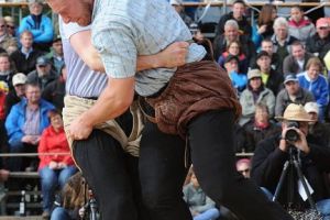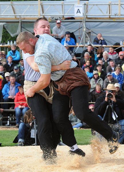 Zuger Kantonalschwingfest Unterägeri, 04.05.2014 Im Schlussgang gewinnt Christian Schuler nach 5.56 Min. gegen Andreas Ulrich. Foto: Alois Omlin retour à l‘aperçu