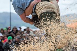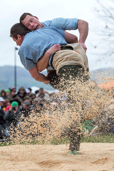 Im Schlussgang gewinnt Schwingerkönig Matthias Sempach nach 1.06 Minuten mit Kurz gegen den Bündner Beat Clopath.