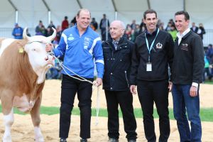 Sieger des AG kant. in Brugg Bruno Gisler mit Siegermuni Bruno, Bundesrat Ueli Maurer, OK Präsident Thierry Burkart, und Sponsor Hansruedi Kyburz