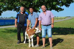 OK Präsident Clemens Gurtner, Spender Thomas Schweikert Trösch Fenster und Gabenchef Pius Zehnder mit Kalb MARION