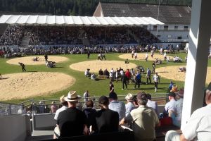 Im beschaulichen Tramelan im Berner Jura auf 1000 m.ü.M. sind die 5250 Sitzplätze schon zum Anschwingen recht gut besetzt. Der Hockeyklub, Fusballklub und der Schwingklub von Tramelan , zusammen mit dem Bern. Jura. Schwingerverband haben es wiederum verstanden , ein würdiges Schwingfest für den Berner Ehrentag zu organisieren.