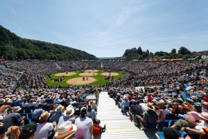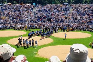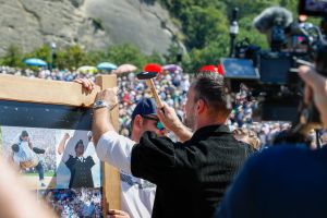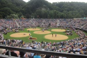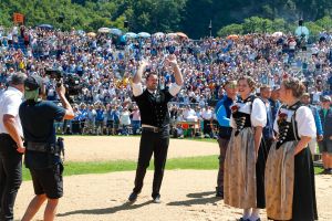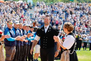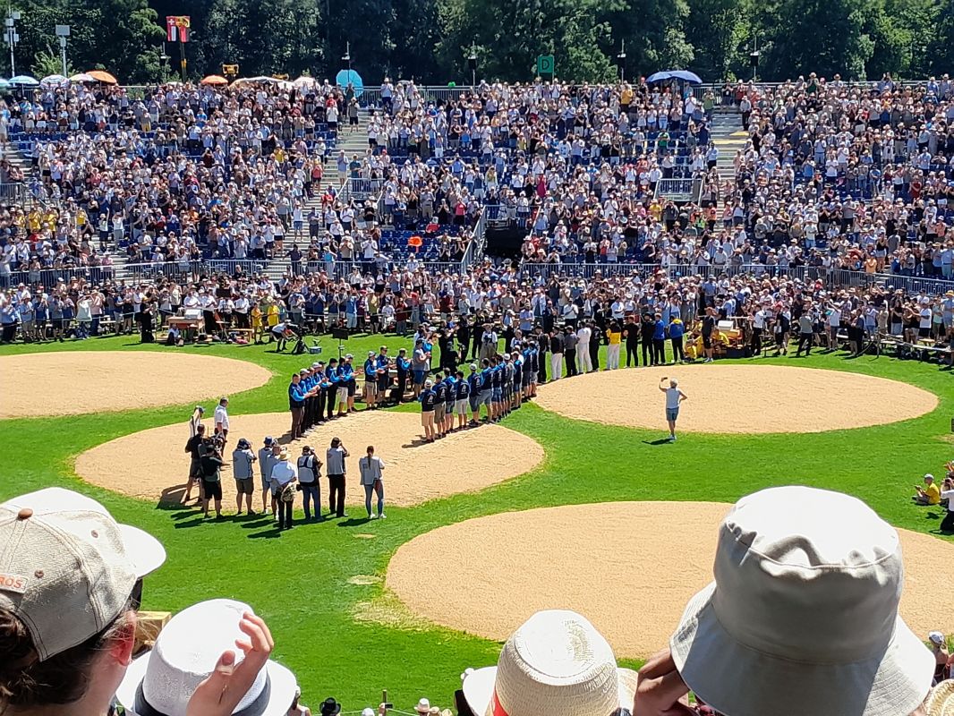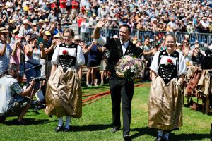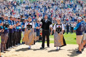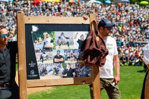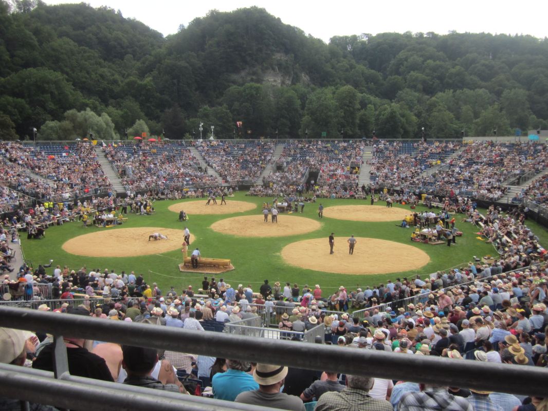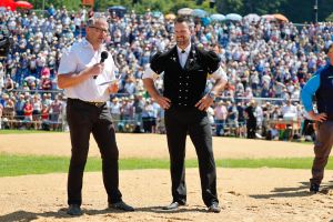 Weiter geht es um 13.00 Uhr mit einem Zwischenhöhepunkt, nämlich der Verabschiedung Kilian Wenger vom Aktiven Schwingsport. Die grandiose Arena eignet sich wunderbar um so einen grossen Schwinger vor so viel Publikum noch einmal zu würdigen. Mit einer kurzen, emotionalen Rede lässt Jakob Aeschbacher Präsident des Bern. Kant. Schwingerverbandes die grossartige Karriere von Schwingerkönig Kilian Wenger noch einmal hochleben. Wenger schlägt den Nagel ein und hängt die Schwinghose daran ein letztes Mal auf. Die fast vollständig besetzte Arena dankt dies mit einem Standing Ovation.