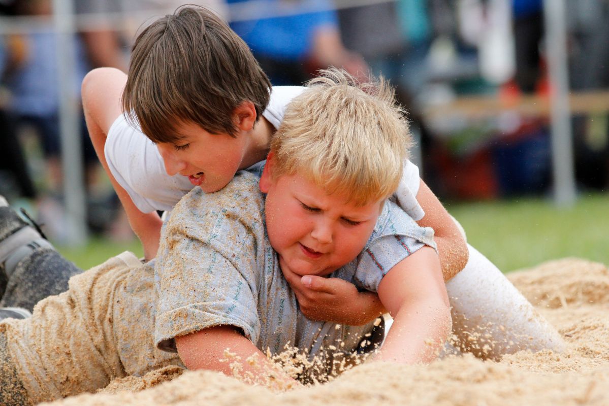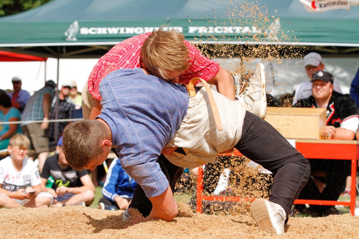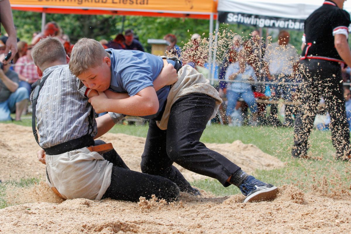 Bucher Yanik (2003), Rothrist, Schwingklub Zofingen gegen Schick Janis (2003), Bennwil, Bezirksschwingklub Waldenburg. Bucher Yanik gewinnt in der dritten Minute mit Hüfter.