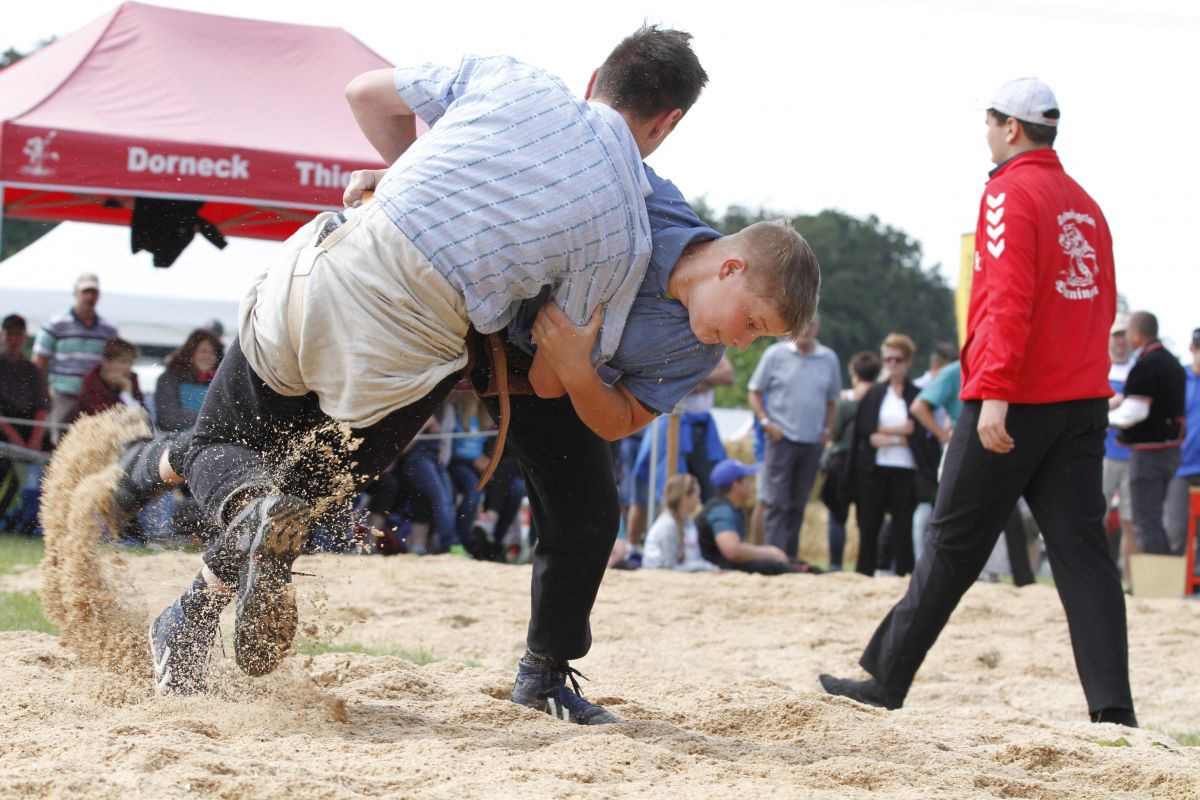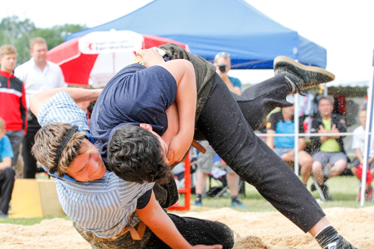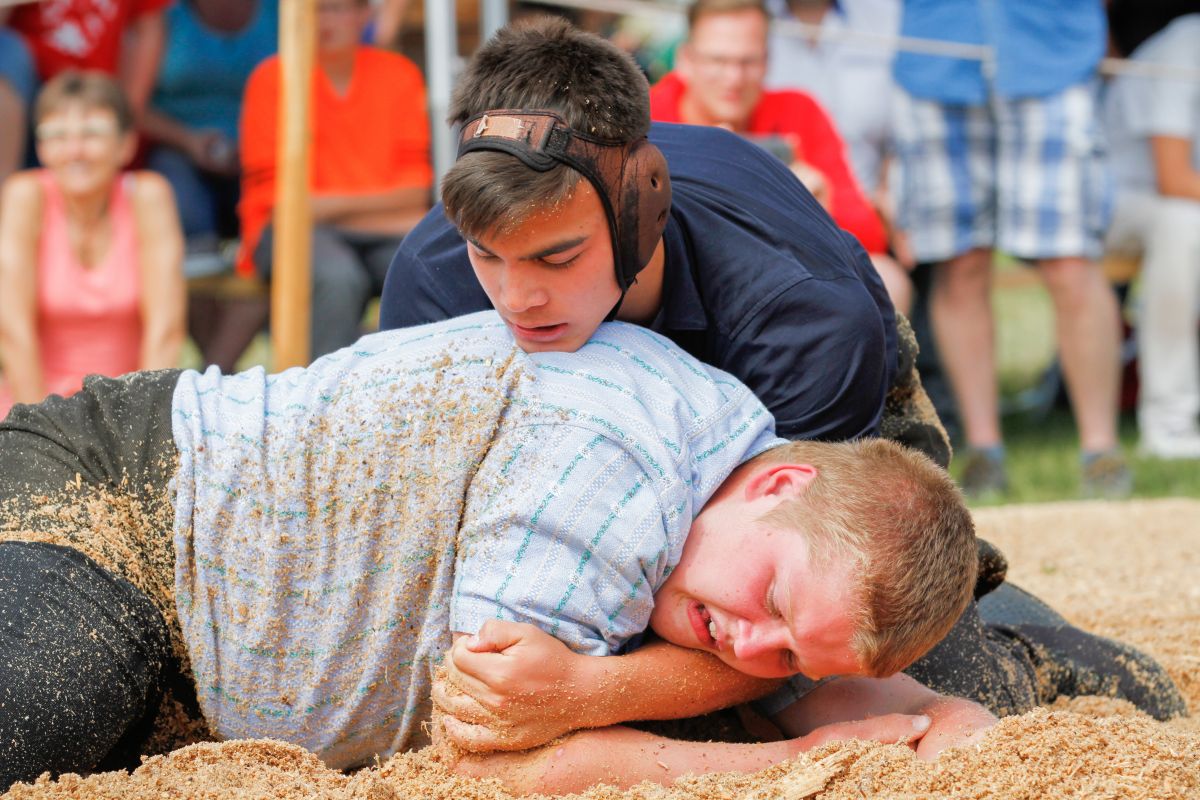 Järmann Florian (2002), Remetschwil, Schwingklub Lenzburg gegen Vogel Remo (2001), Berdietikon, Schwingklub Freiamt. Järmann Florian gewinnt gegen den Kranzer in Minute 6:27 mit Hochschwung.