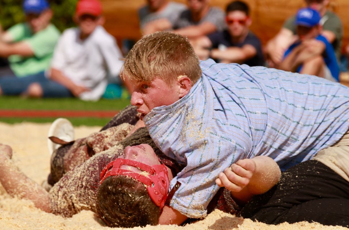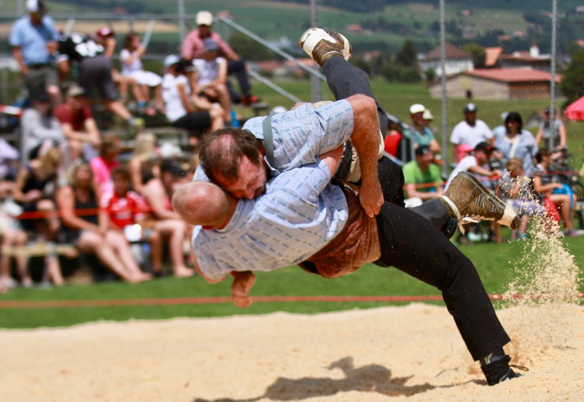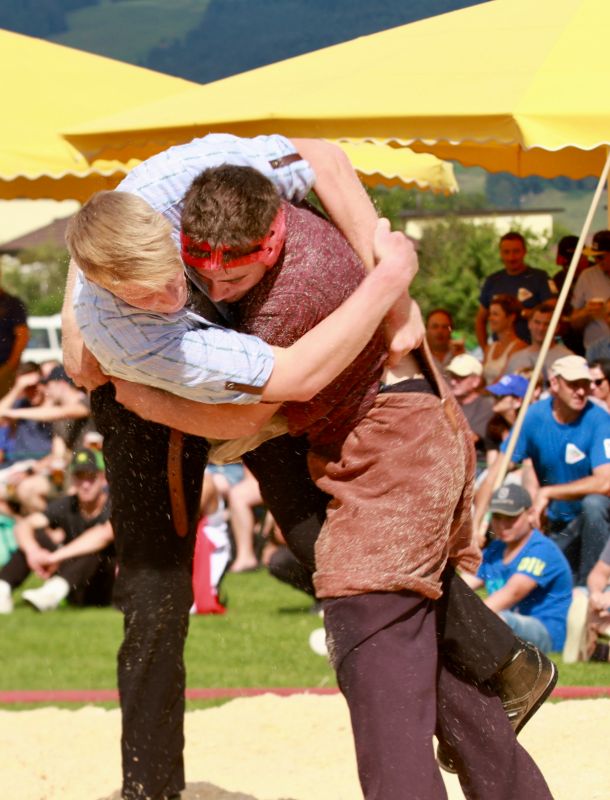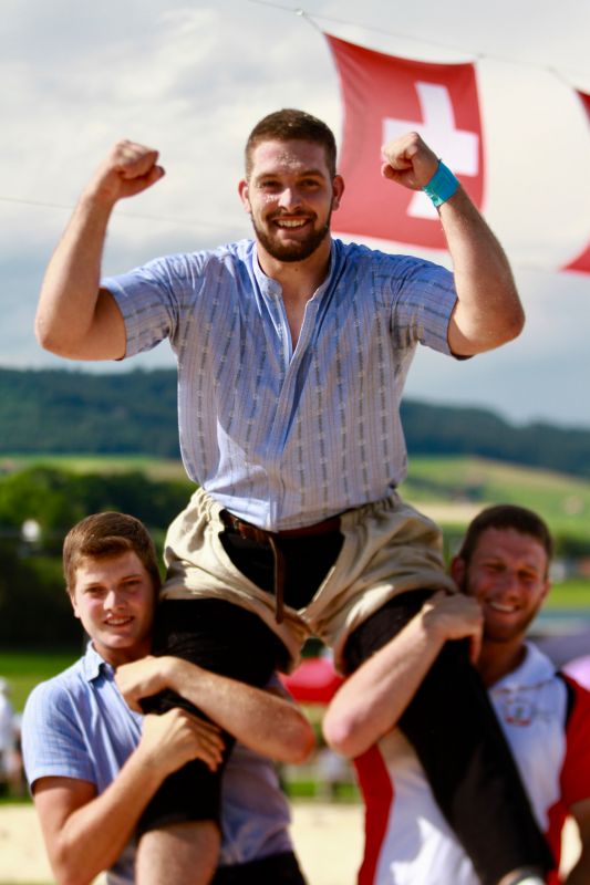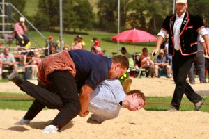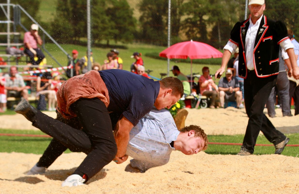 Benjamin Gapany de Marsens remporte la fête cantonale fribourgeoise en battant en passe finale le couronné fédéral Andreas Ulrich du club invité de Am Mythen, après une minute avec un puissant kurz.