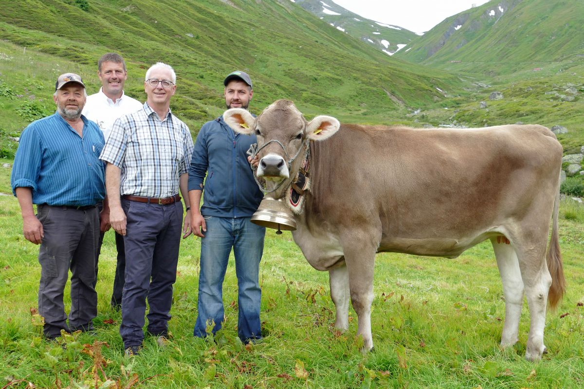 Das trächtige Rind «Bianca» ist der Siegerpreis am diesjährigen Allweg-Schwinget und wird von Besitzer Andreas Risi, Allweg OK-Präsident Werner Durrer, Bruno von Wyl als Vertreter der Firma Leister sowie Stefan Risi, dem Sohn des Besitzers, präsentiert.