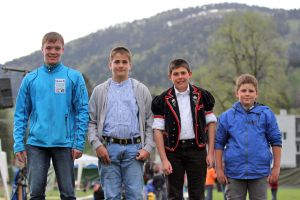 • Ebnat-Kappel SG, 27. April 2019, Schwingen - Buebeschwinget. Festsieger - Tobias Schoenenberger(Wil), Simon Fäh (Benken SG), Simon Zurbuchen (Habkern) und Philipp Höhener (Gais) v.l.n.r. (Pascal Schoenenberger)