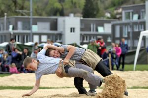 • Ebnat-Kappel SG, 27. April 2019, Schwingen - Buebeschwinget. Hoehener Philipp (li, Gais) gegen Moser Saemi (re; Mutten). (Pascal Schoenenberger)