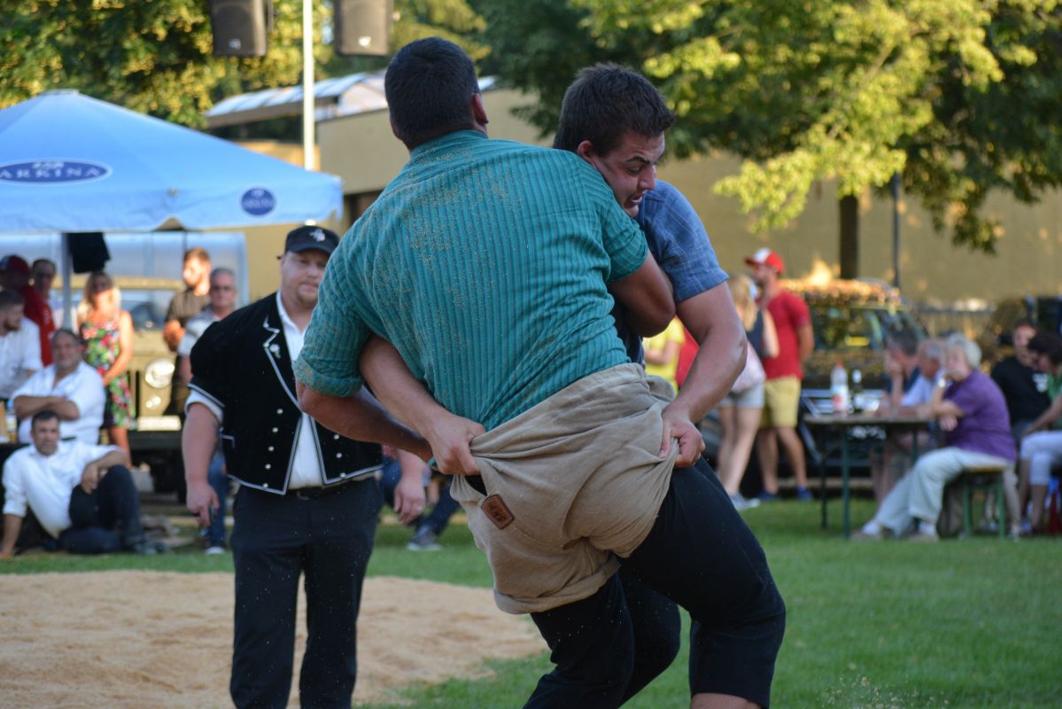 Um 13.45 begrüsste der Vereinspräsident David Schreiber die 57 Aktivschwinger. Unter den drei Eidgenossen war auch der einheimische Schmid David am Start. Zu Gast war der Schwingklub Unterthurgau mit dem Eidgenossen Tobias’ Krähenbühl. Ebenfalls zu Gast waren die Schwinger vom Schwingklub Küssnacht am Rigi. Auf vier tadellos vorbereiteten Plätzen durften die Schwinger das Fest antreten. Die beiden Eidgenossen Schmid David und Krähnebühl Tobias konnten beim ersten zusammengreifen kein Resultat erzielen. Der Eidgenosse Räbmatter Patrick musste beim Anschwingen gegen Strebel Joel eine Niederlage hinnehmen. Im zweiten Gang musste wegen eins starken vorbeiziehenden Gewitters der Schwingbetrieb kurz eingestellt werden. Vor dem sechsten Gang betraten die Steinstösser die Arena und trugen noch ihren Final aus. Der Fricktaler Hunziker Simon aus Herznach konnte diesen Wettkampf für sich entscheiden. Er stösst den 70kg schweren Fricktaler Stein auf eine Weite von 3.85m.