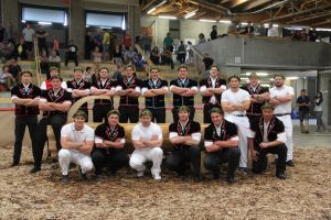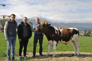 v.l. Daniel und Philipp Sterki, Vertreter des Lebendpreissponsors, Sterki Bau AG, Solothurn, Niklaus Burri, Niederbipp, Besitzer und Lebendpreis des 123. Solothurner Kantonal Schwingfestes «Othmar».