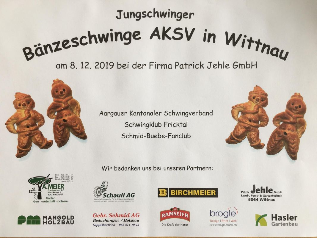 Am Sonntag, den 08. Dezember 2019 veranstaltete der AG Kant. Schwingerverband und der Fanklub «Schmied Buebe» das letzte Schwingfest der Jungschwinger der Saison. Erstmals wird das Schwingfest als Première bei Familie Jehle in Wittnau durchgeführt und in dieser Konsultation. Ein gelungener Start für eine Tradition für die Zukunft. Um 09.30 stiegen die Jungschwinger in die Zwilchhosen und bestritten die Kämpfe in fünf Kategorien. Die Schlussgänge machen folgen Jungathleten unter sich aus: