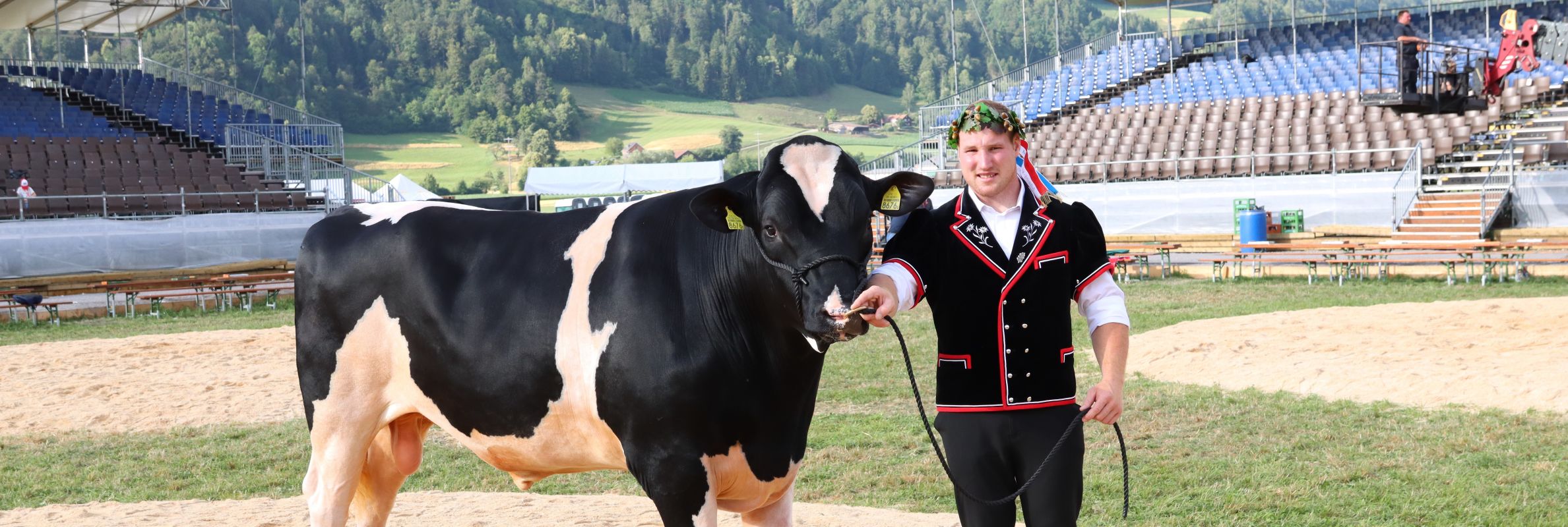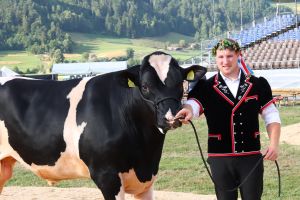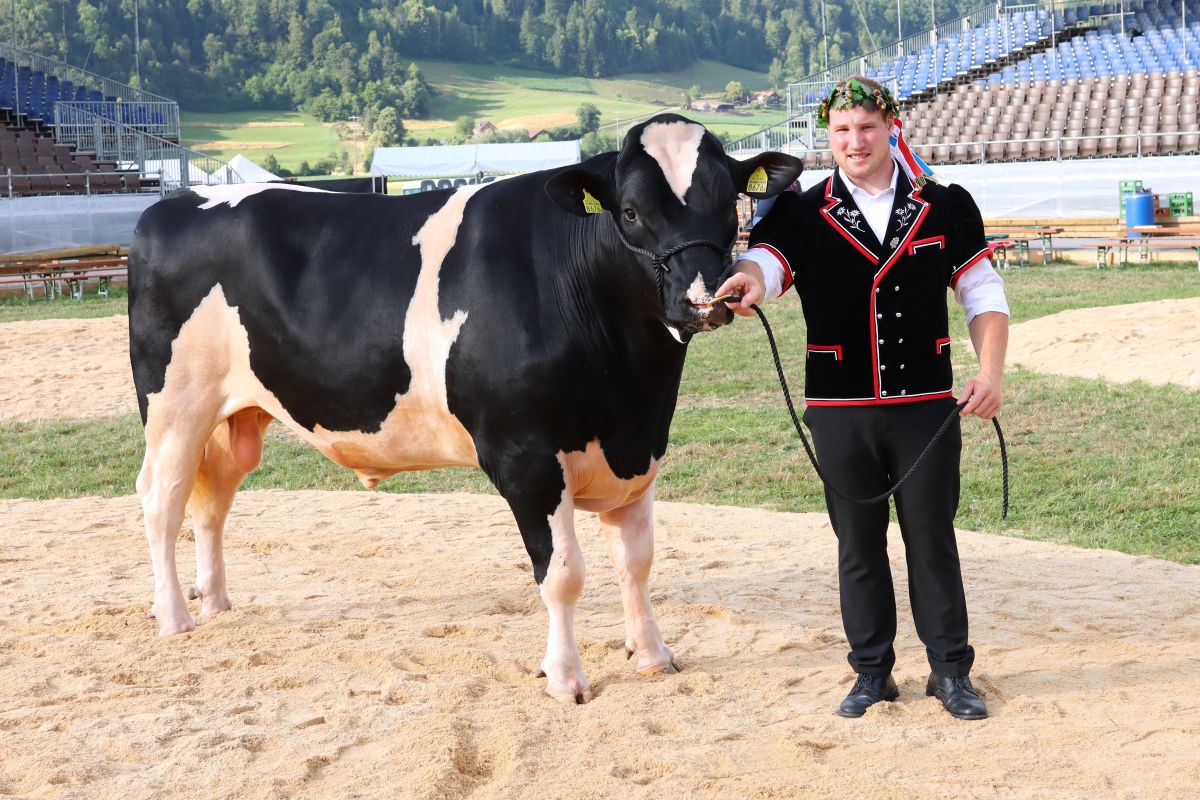 Der strahlende Sieger Joel Wicki mit dem Holsteinstier "Toni", Foto Hans Schnider