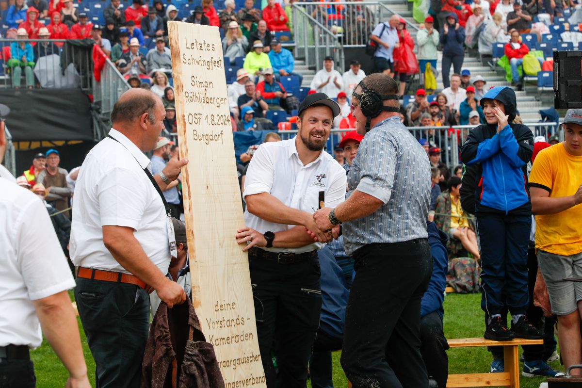 01.08.2024, Oberaargauisches Schwingfest Burgdorf, Röthlisberger Simon hängt die Hosen an den Nagel