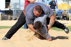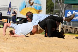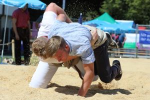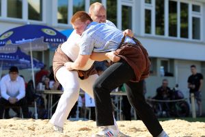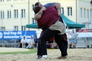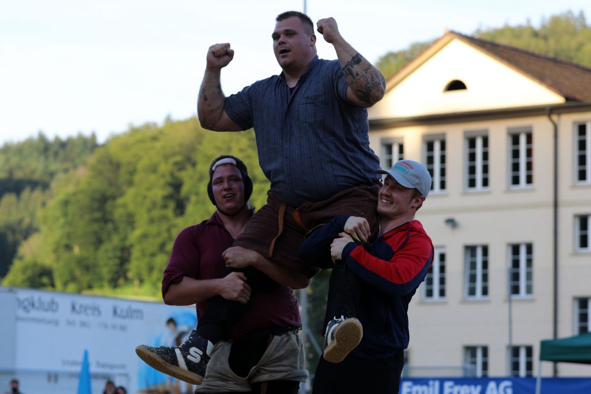 Lokalmatador Patrick Räbmatter Uerkheim, SK Zofingen) bewingt nach 7 Minuten 40 Sekunden Kaj Hügli (Reitnau, SK Aarau) mit Linksgammen. Der einzige Eidgenosse im Feld der 36 Schinger wurde beim ersten Rangschwinget in der Nordwestschweiz seiner Favoritenrolle vollumfänglich gerecht und dominierte das Fest mit sechs Siegen.