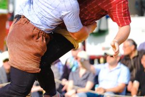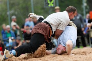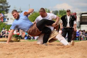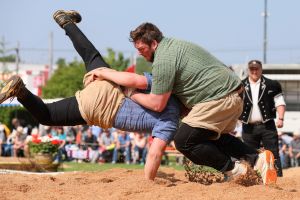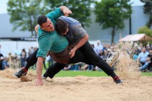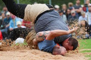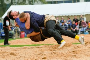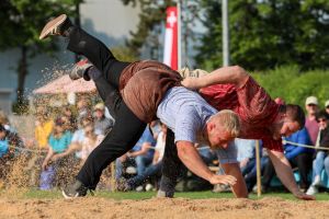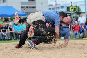 Dass es knapp werden würde, war schon in der Mittagspause klar. Der Baselbieter Odermatt Adrian lag gemeinsam mit dem erst 17-jährigen Roth Jan an der Spitze, vor den beiden Top-Favoriten Räbmatter Patrick und Strebel Joel sowie Voggensperger Lars, einem weiteren Baselbieter. Doch weil alles dicht beieinander lag, wurde die Rangliste am Nachmittag gehörig auf den Kopf gestellt und nur einer des Spitzenquintetts konnte seine gute Ausgangslage nutzen. Räbmatter verabschiedete sich im vierten Gang mit seinem zweiten Gestellten aus der Entscheidung, Roth und Odermatt konnten weder im vierten noch im fünften Gang ihre Gegner ins Sägemehl drücken. Mit Erb Roger vom Schwingklub Oberwil hatte dafür der Lokalmatador bis zum Schluss Chancen auf den Schlussgang, musste allerdings seinen Traum vom Heimsieg nach einer klaren Niederlage gegen Döbeli im fünften Gang begraben. Strebel hingegen besiegte dort Voggensperger Lars und nahm damit so etwas wie Revanche – im Anschwingen musste er gegen dessen Bruder Janic stellen. Bis eben die zehnte Minute des Schlussgangs anbrach und Strebel, nachdem er in diesem finalen Kampf der bis dato aktivere Schwinger war, nach einer Unachtsamkeit zum zweiten Mal geschlagen war.