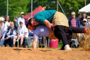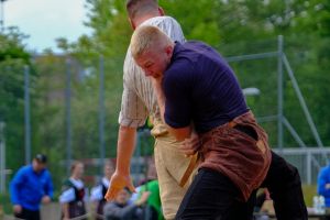 • Schlussgang Döbeli Andreas (blaues Hemd) wuchtet Strebel Joel mit einem Kurz in die Luft