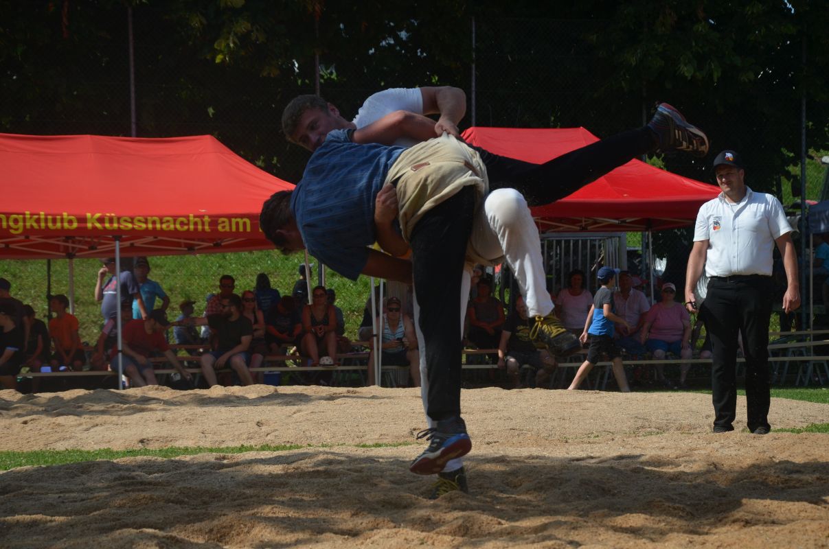 Der 79. Schwyzer kantonale Nachwuchsschwingertag in Wilen bei Wollerau wird in doppelter Hinsicht als einer der heissesten in Erinnerung bleiben. Einerseits weil man viele spannende Kämpfe beobachten konnte, andererseits wegen den enorm hohen Temperaturen.