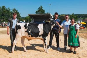 Lario Kramer avec son prix, l'éleveur, le donateur et Roxane Berset, présidente du CO