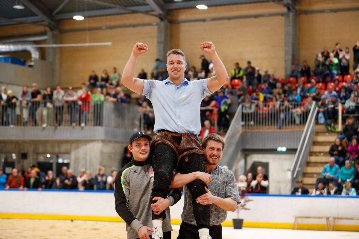 Ensuite, le dimanche 30 avril, ce ne sont pas moins de 1'500 visiteurs qui ont fait le déplacement au stade « de sciure » pour suivre les 142 lutteurs actifs dont 10 couronnés fédéraux. Et le spectacle était à la hauteur. Comme par exemple avec Matthieu Burger des Prés d’Orvin qui, lors de sa dernière passe, s’est permis de terrasser son idole de jeunesse, le monumental oberlandais Killian Wenger, sacré roi de la lutte en 2010. Rien que ça ! Burger finira la journée au deuxième rang avec une belle note de 57.75. Place qu’il partagera avec Mathias Aeschbacher dont nous parlerons ici plus bas. Le tramelot Alex Schär, tête de proue régionale, a quant à lui fonctionné en mode alternatif avec un solde de trois victoires et de trois match nul. Alex a plutôt misé sur un jeu de puissance qui lui aura valu au final une honorable sixième place (56.25) et une couronne. Notre espoir régional continue ainsi dans sa belle progression.
