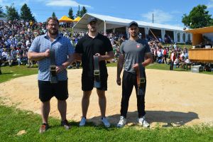 Steinstossen: Daniel Kranzelbinder Rang 3 (3m 47cm), Mauro Betschart Rang 2 (3m 67cm) und Remo Schuler Rang 1 (3m 67cm)