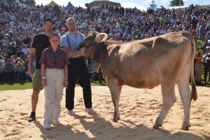 Sieger Samuel Giger mit Siegerrind Tabea und Marco Höfliger von Dividat (Sponsor). Vorne Svea Tochter von Züchter Cyrill Gauch.
