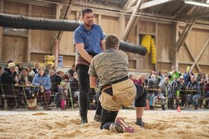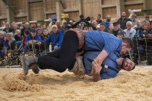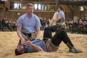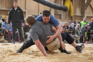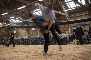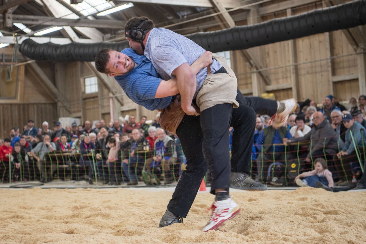 Heimenschwand, 13. März 2022, Schwingen, 22. Hallenschwinget Oberdiessbach 2022. Fabian Staudenmann (V, Guggisberg) gegen Dominik Gasser (H, Eggiwil) (Rolf Eicher/Eicherdigital)