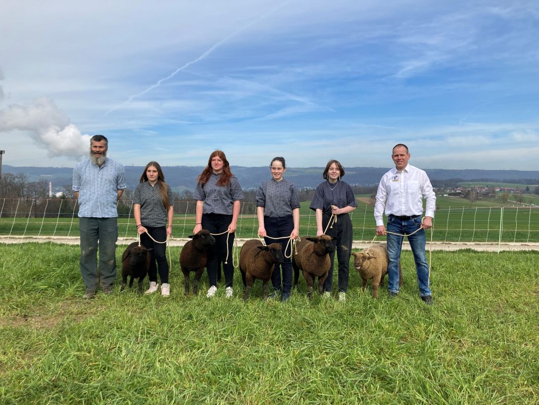 • Die Nachwuchs-Ehrendamen mit den Lebendpreisen für die Jungschwinger, Züchter Florian Kalt (links) und Präsident des Schwingklubs Zurzibiet Nik Meier