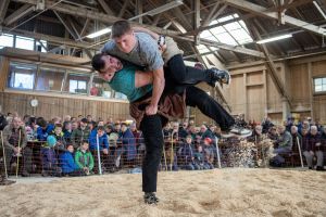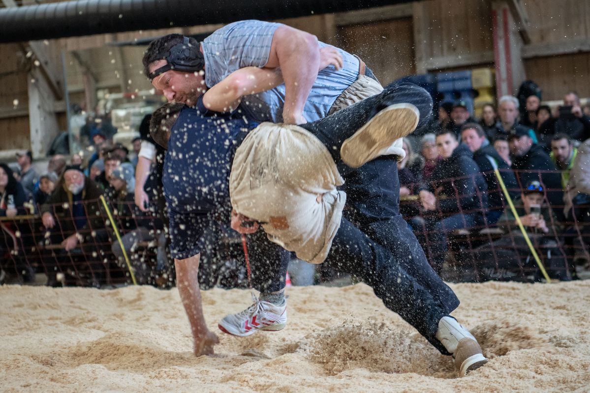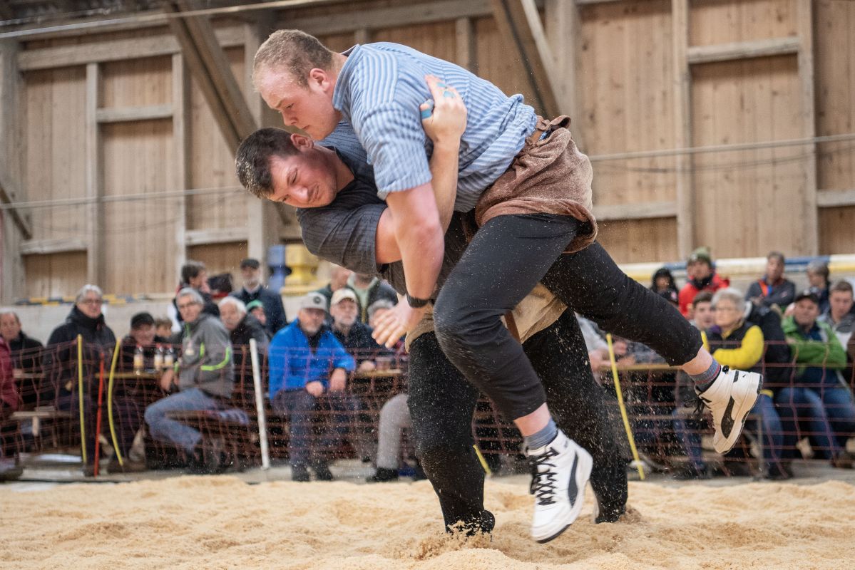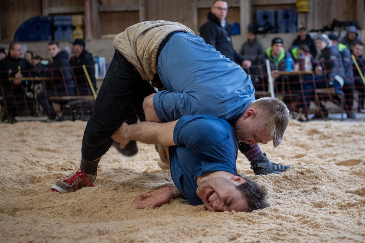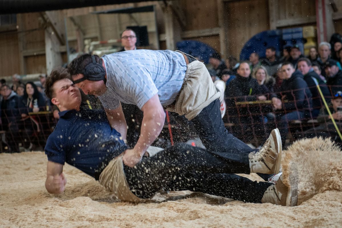 Heimenschwand, 12. März 2023, Schwingen, 23. Hallenschwinget Oberdiessbach 2023. Steve Duplan (H, Aigle) gegen Thomas Fankhauser (V, Steffisburg) (Rolf Eicher)
