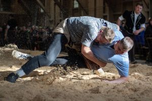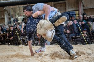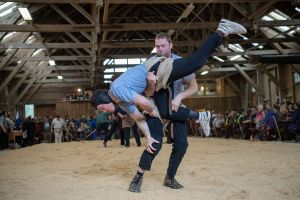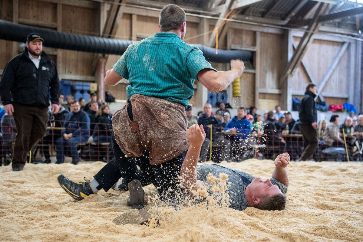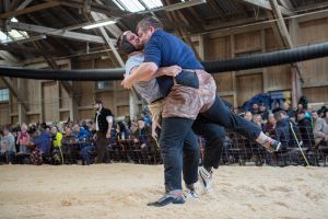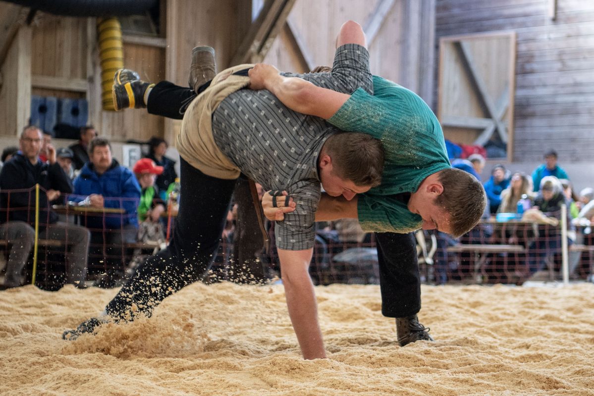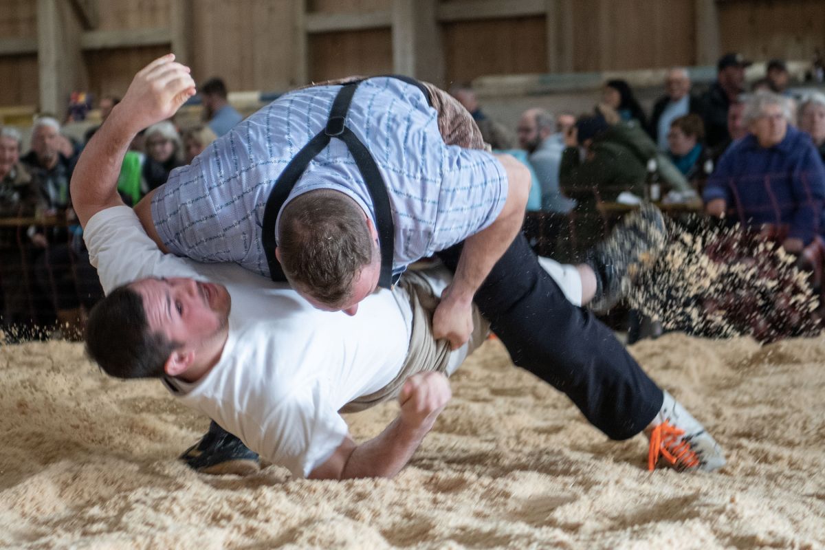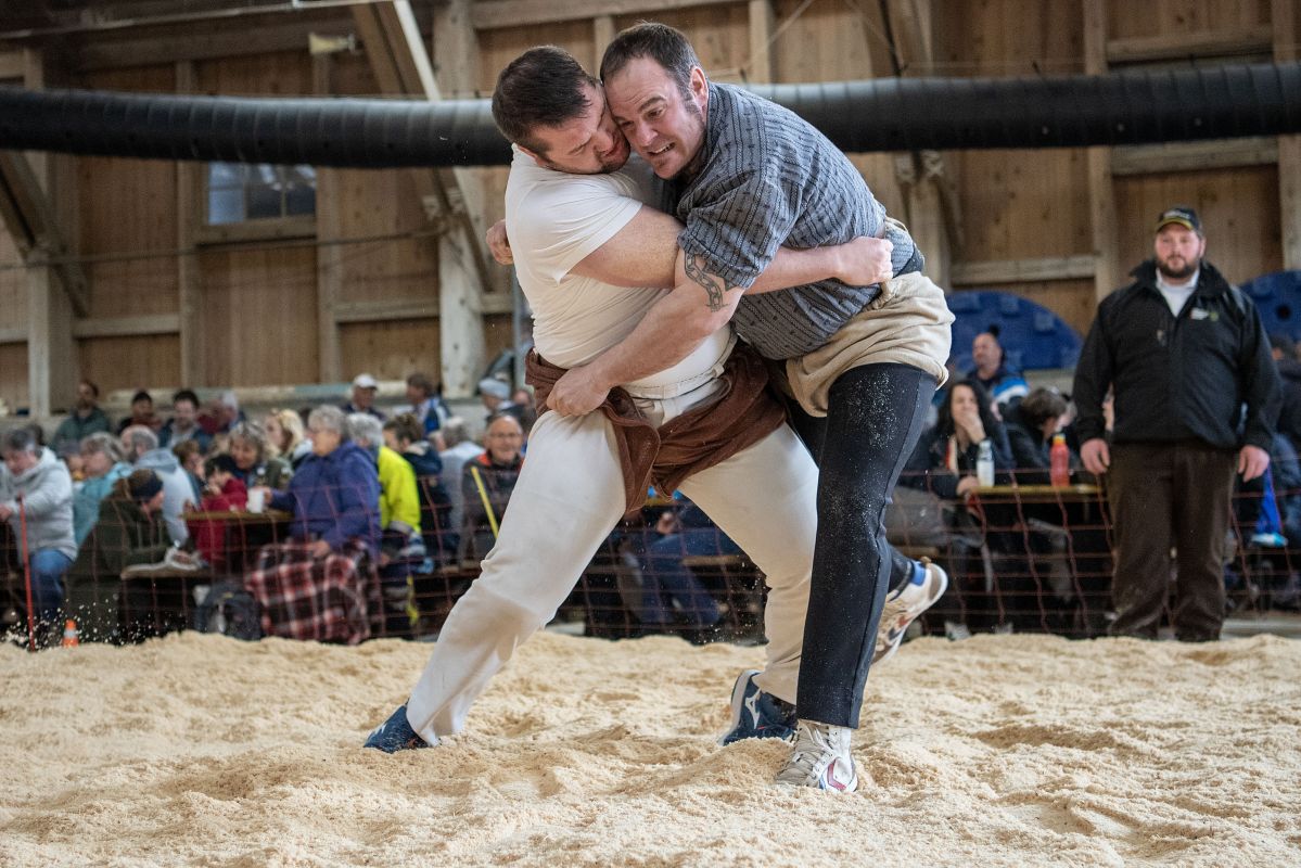 Heimenschwand, 12. März 2023, Schwingen, 23. Hallenschwinget Oberdiessbach 2023. Steve Duplan (H, Aigle) gegen Thomas Fankhauser (V, Steffisburg) (Rolf Eicher)