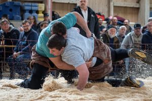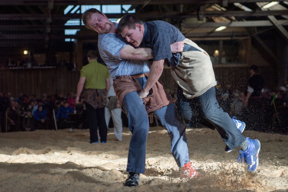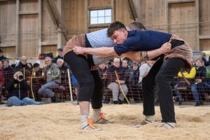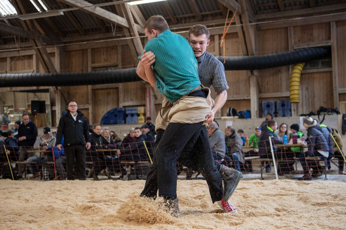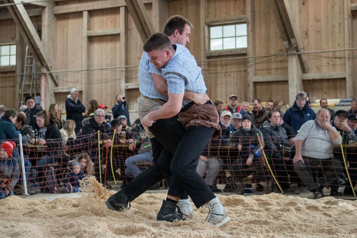 Heimenschwand, 12. März 2023, Schwingen, 23. Hallenschwinget Oberdiessbach 2023. Steve Duplan (L, Aigle) gegen Fabian Aebersold (R, Walterswil) (Rolf Eicher)