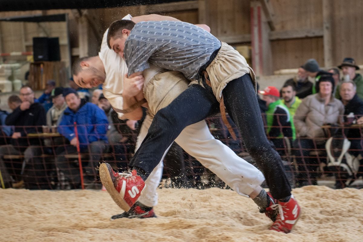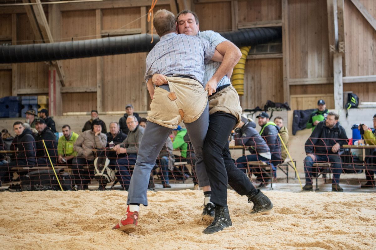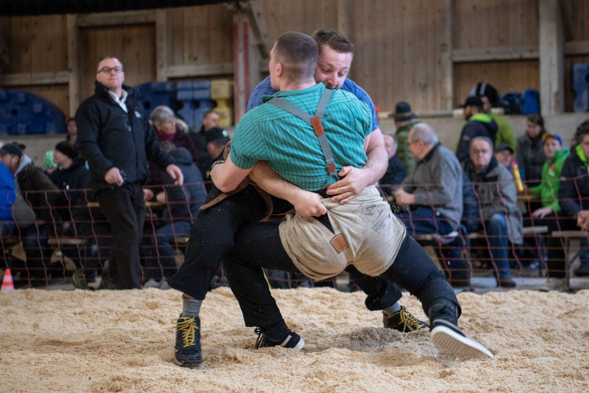 Heimenschwand, 12. März 2023, Schwingen, 23. Hallenschwinget Oberdiessbach 2023. Christian Rüegsegger (V, Zäziwil) gegen Martin Gaël (U, Haute-Broye) (Rolf Eicher)