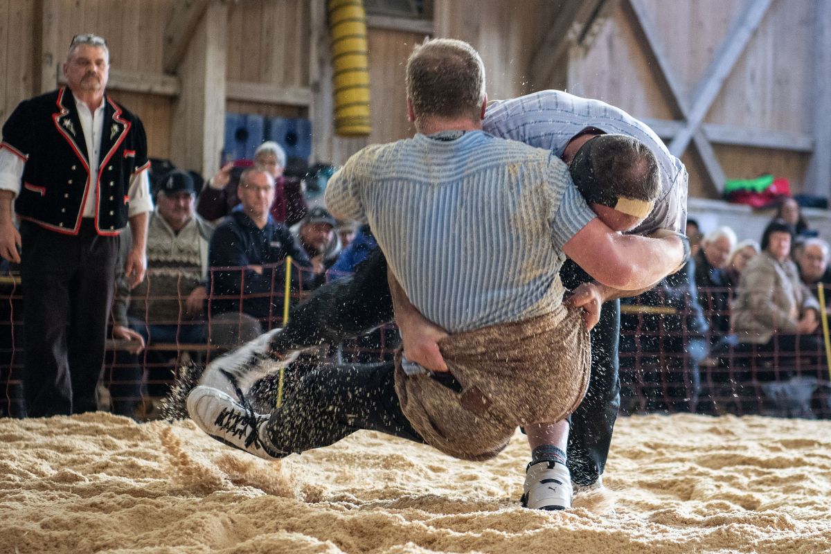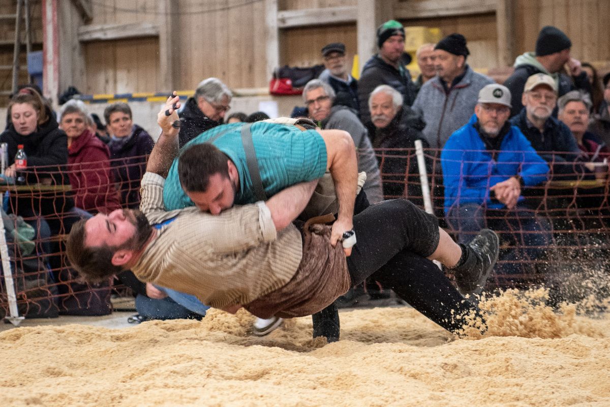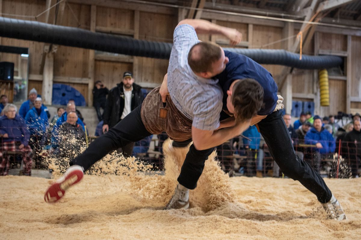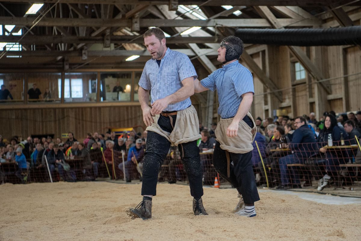 Heimenschwand, 12. März 2023, Schwingen, 23. Hallenschwinget Oberdiessbach 2023. Christian Rüegsegger (H, Zäziwil) gegen Martin Gaël (V, Haute-Broye) (Rolf Eicher)