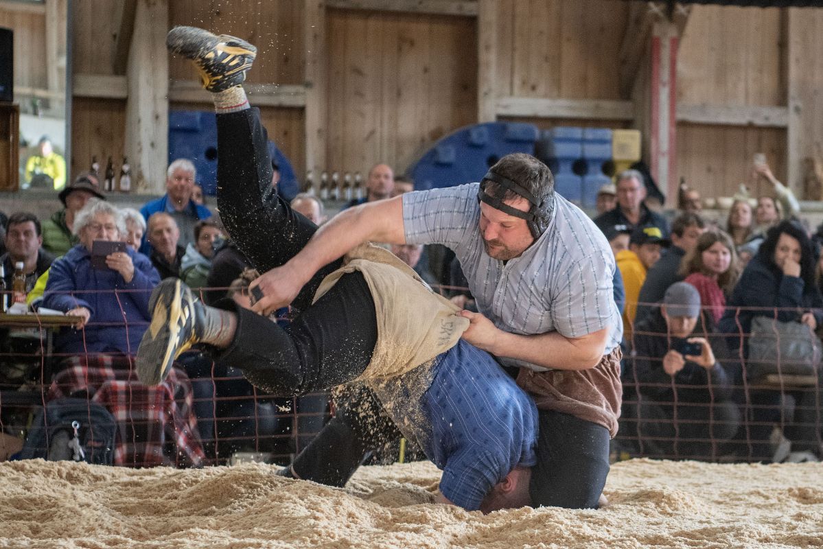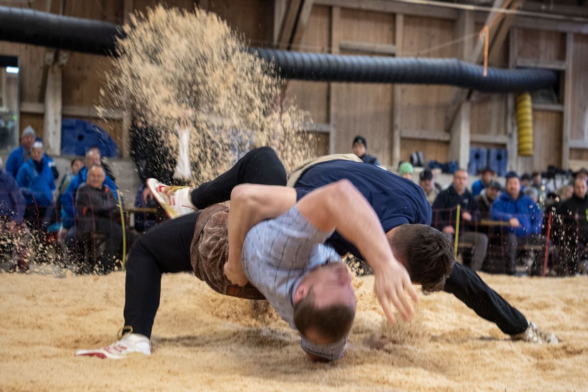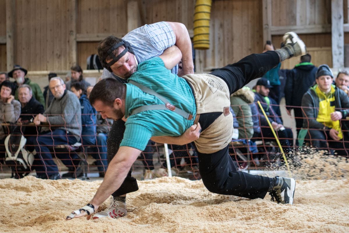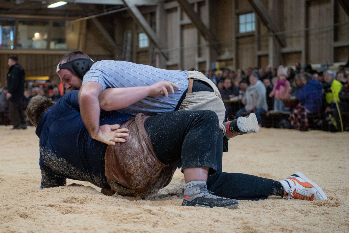 Heimenschwand, 12. März 2023, Schwingen, 23. Hallenschwinget Oberdiessbach 2023. David Scheuner (V, Oberlangenegg) gegen Matthias Aeschbacher (H, Rüegsauschachen) (Rolf Eicher)