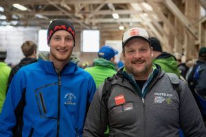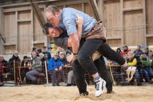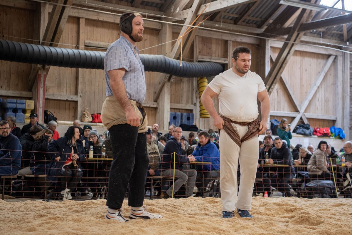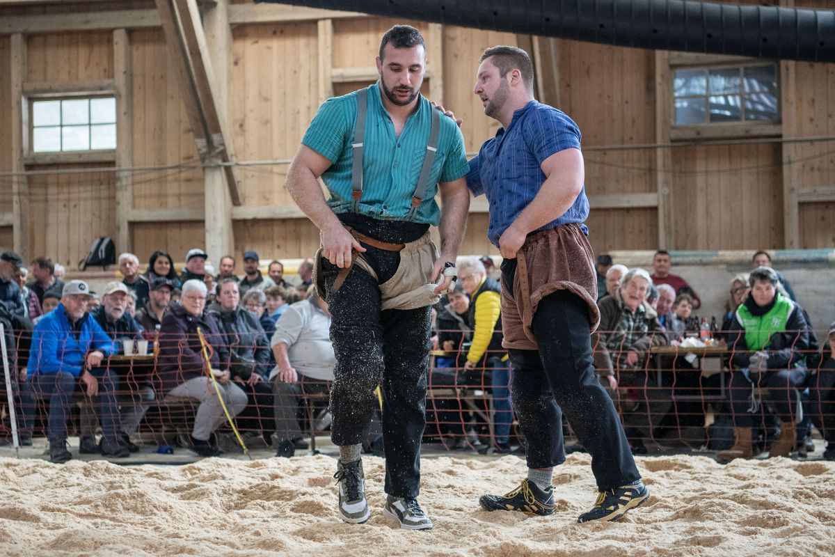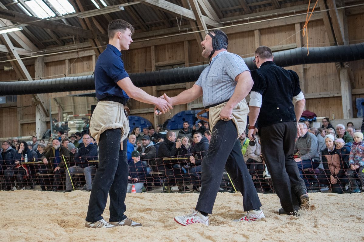 Heimenschwand, 12. März 2023, Schwingen, 23. Hallenschwinget Oberdiessbach 2023. Swiss Skills Weltmeister im Gartenbau Fabian Baumann (L, Oberdiessbach) Mitglied Schwingklub Oberdiessbach und Aktivschwinger Thomas Sempach (R, Heimenschwand) (Rolf Eicher)