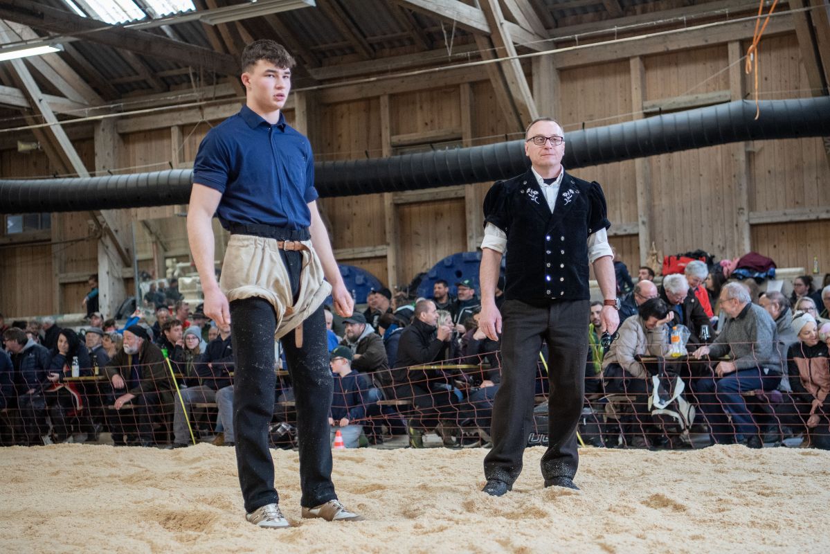 Heimenschwand, 12. März 2023, Schwingen, 23. Hallenschwinget Oberdiessbach 2023. Michael Moser (L, Arni) Kampfrichter Rolf Schüpbach (R, Walkringen) (Rolf Eicher)