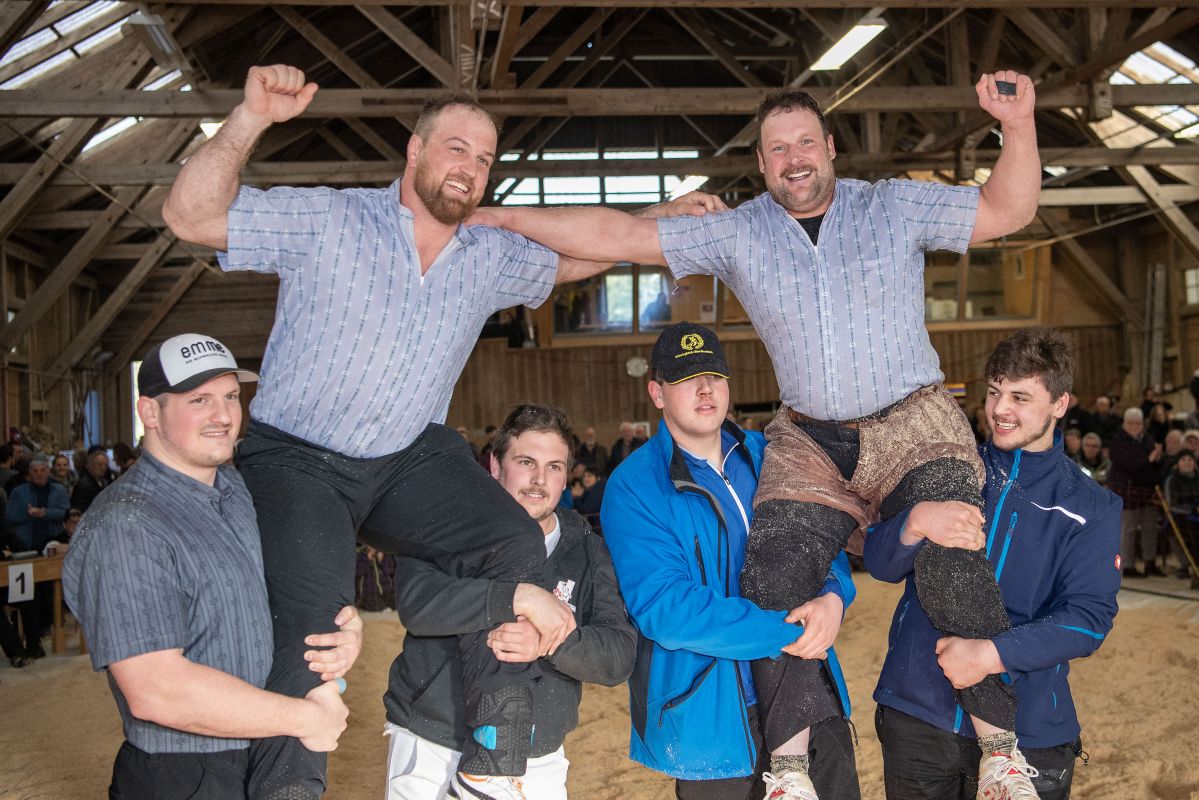 Heimenschwand, 12. März 2023, Schwingen, 23. Hallenschwinget Oberdiessbach 2023. Die beiden Festsieger Matthias Aeschbacher 1b (L, Rüegsauschachen) 1a Thomas Sempach (R, Heimenschwand) (Rolf Eicher)