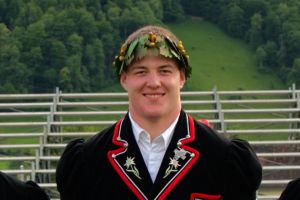 Lukas Bissig mit Kranz und Siegerpreis