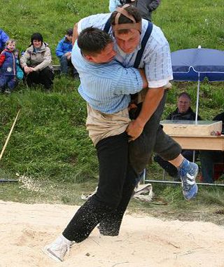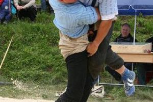 36. Schwing- und Älplerfest Ramslauenen Reichenbach im Kandertal BE, 15.06.2008Kilian Wenger bezwingt Thomas Sempach. retour à l‘aperçu