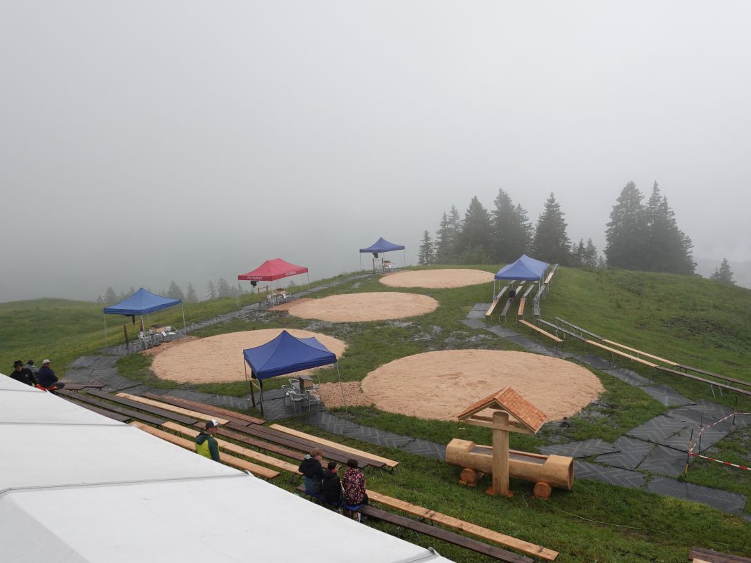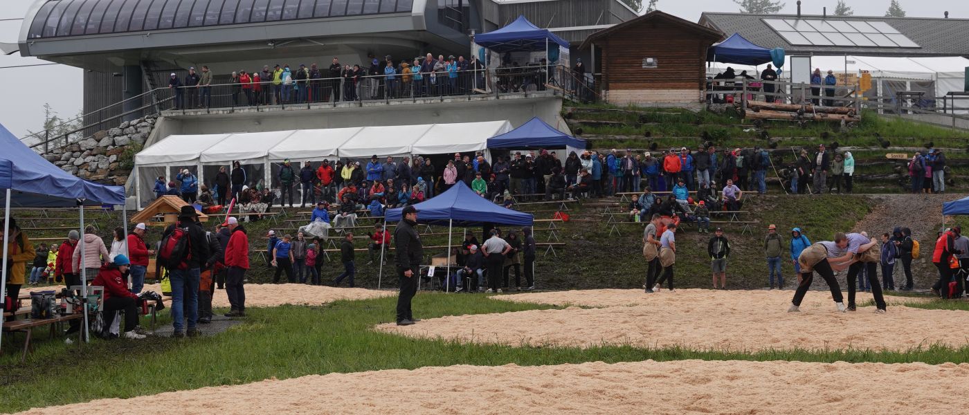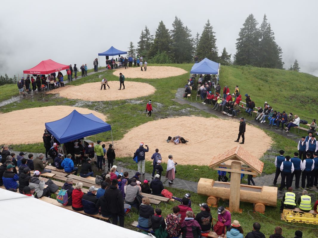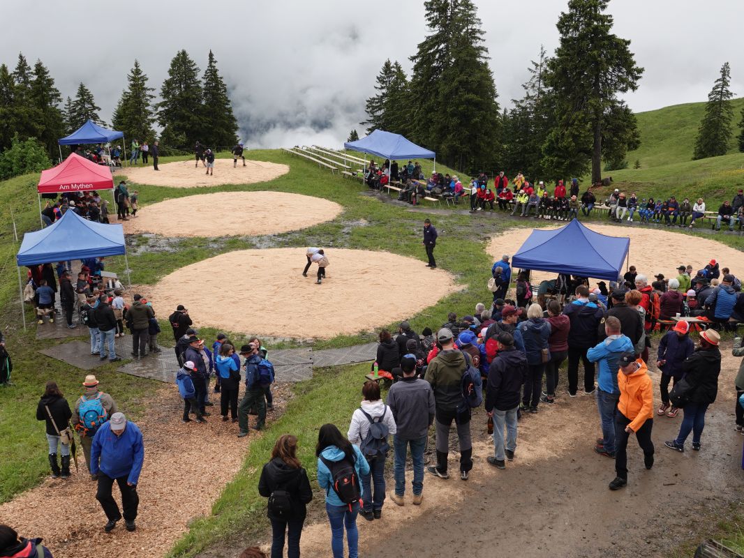 Mit viel Einsatz richtete der organisierende Schwingerverband am Mythen unter der Leitung von OKP Mike Bürgler das Kantonale der Jungen aus. Pünktlich auf den Festtag hin stellte der Regen ab. Am Morgen gewährte jedoch dichter Nebel nur gerade die Sicht auf den Festplatz, am Nachmittag lockerte sich zaghaft das dicke Grau, so dass die Besucher doch noch etwas die Aussicht geniessen konnten. Das vorwiegend nasse Wetter der letzten Tage liess den Schwingplatz auf dem 1591 Meter hoch gelegenen Joseph Platz neben der Rotenflue Bergstation ziemlich leiden. Doch die Organisatoren nahmen grosse Mühe auf sich, um die Bedingungen für alle erträglicher zu machen. Der Schwyzer kantonale Nachwuchsleiter Armin auf der Maur durfte beim morgendlichen Apell 182 Wettkämpfer auf dem Schwyzer Hausberg begrüssen.