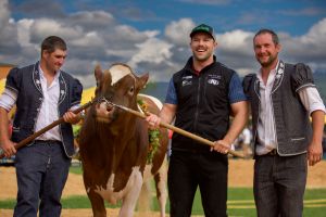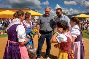 250803 le Vainqueur Fabian Staudenmann *** et les Demoiselles d'Honneurs la 100ÈME FÊTE CANTONALE FRIBOURGEOISE DE LUTTE SUISSE à le LE CRÊT-PRÈS-SEMSALES, 03.08.2025 "Bild sports-suisse.ch"