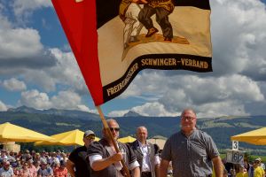 250803 avec le Président Marc Fahrni à la Remise de la Bannière à la 100ÈME FÊTE CANTONALE FRIBOURGEOISE DE LUTTE SUISSE à le LE CRÊT-PRÈS-SEMSALES, 03.08.2025 "Bild sports-suisse.ch"