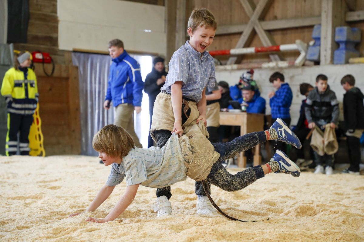 9. März 2024, Hallenschwinget Oberdiessbach, Buebeschwinget, Reithalle Heimenschwand, Schlussgang Kategorie Jg 2009 - 2010, Karlen Fabio, Boltigen (links) - Scheuner Adrian, Oberlangenegg (rechts)
