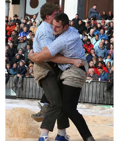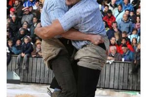 Arnold Forrer konterte in der fünften Minute einen Kurzzug seines Klubkameraden Köbi Roth mit Gammen/Kreuzgriff und gewann zum dritten Mal den OLMA-Schwinget.
