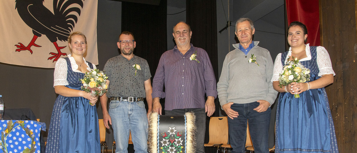 Obmannschaft: Roger Beuchat, Werner Imlig, Godi Suter umrahmt von Ehrendamen
